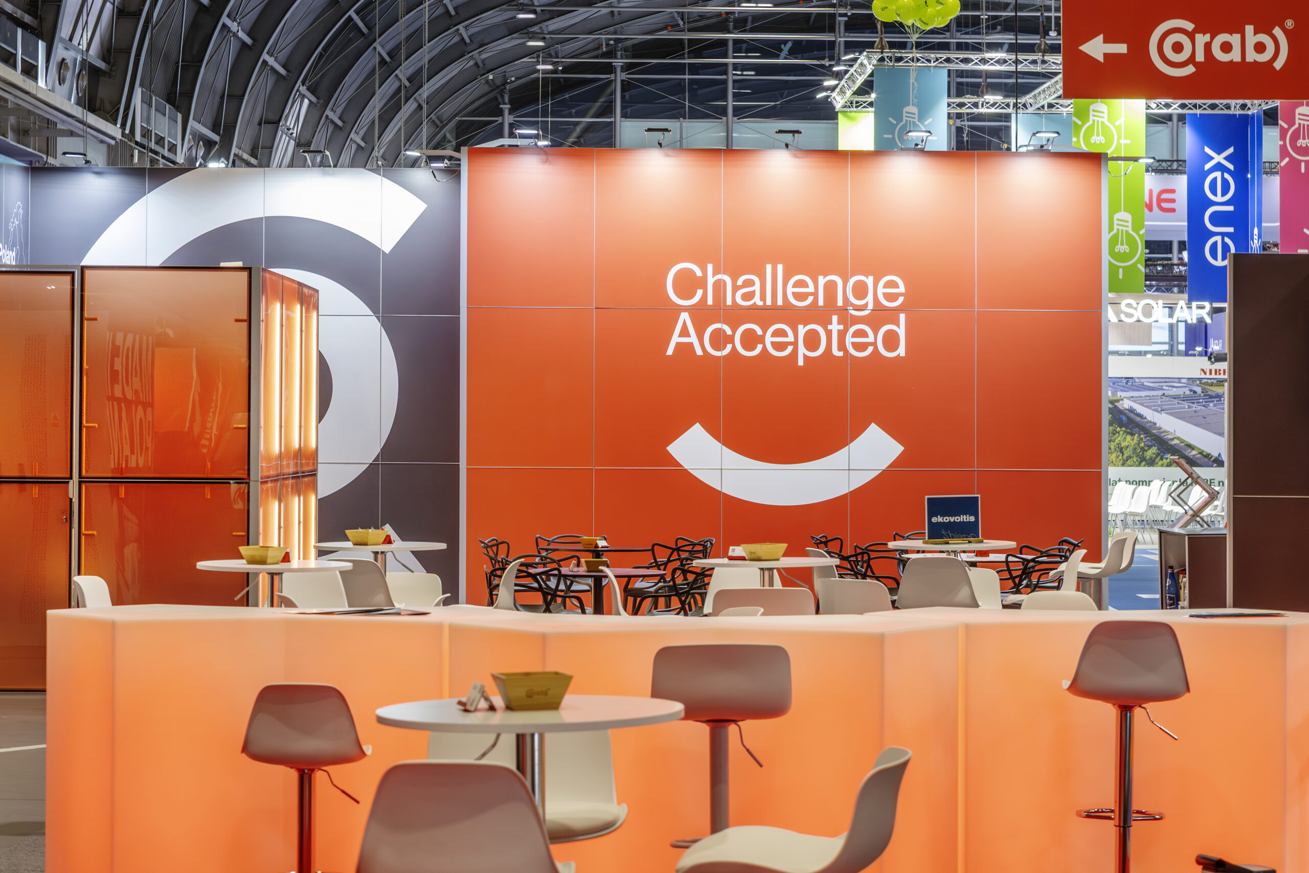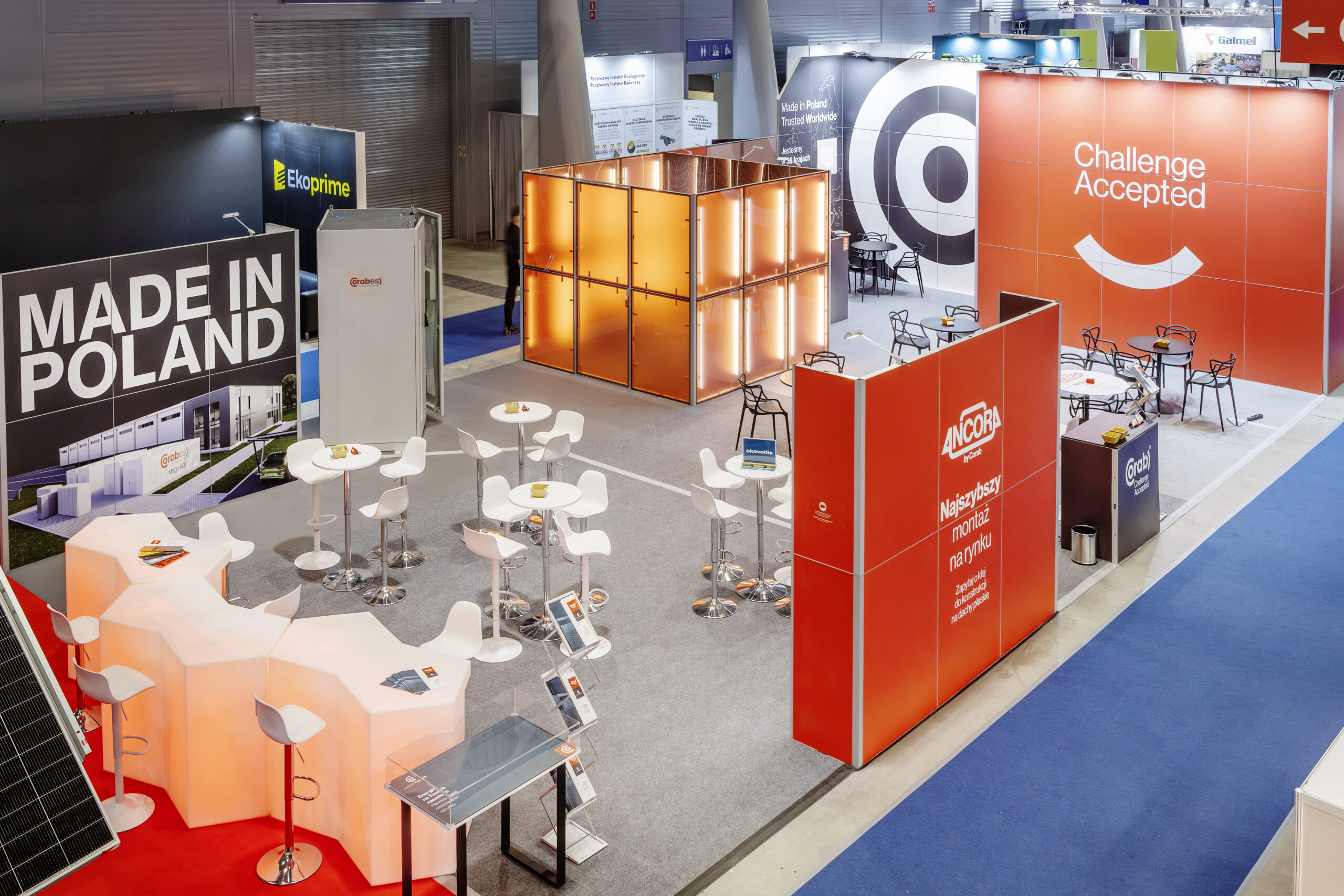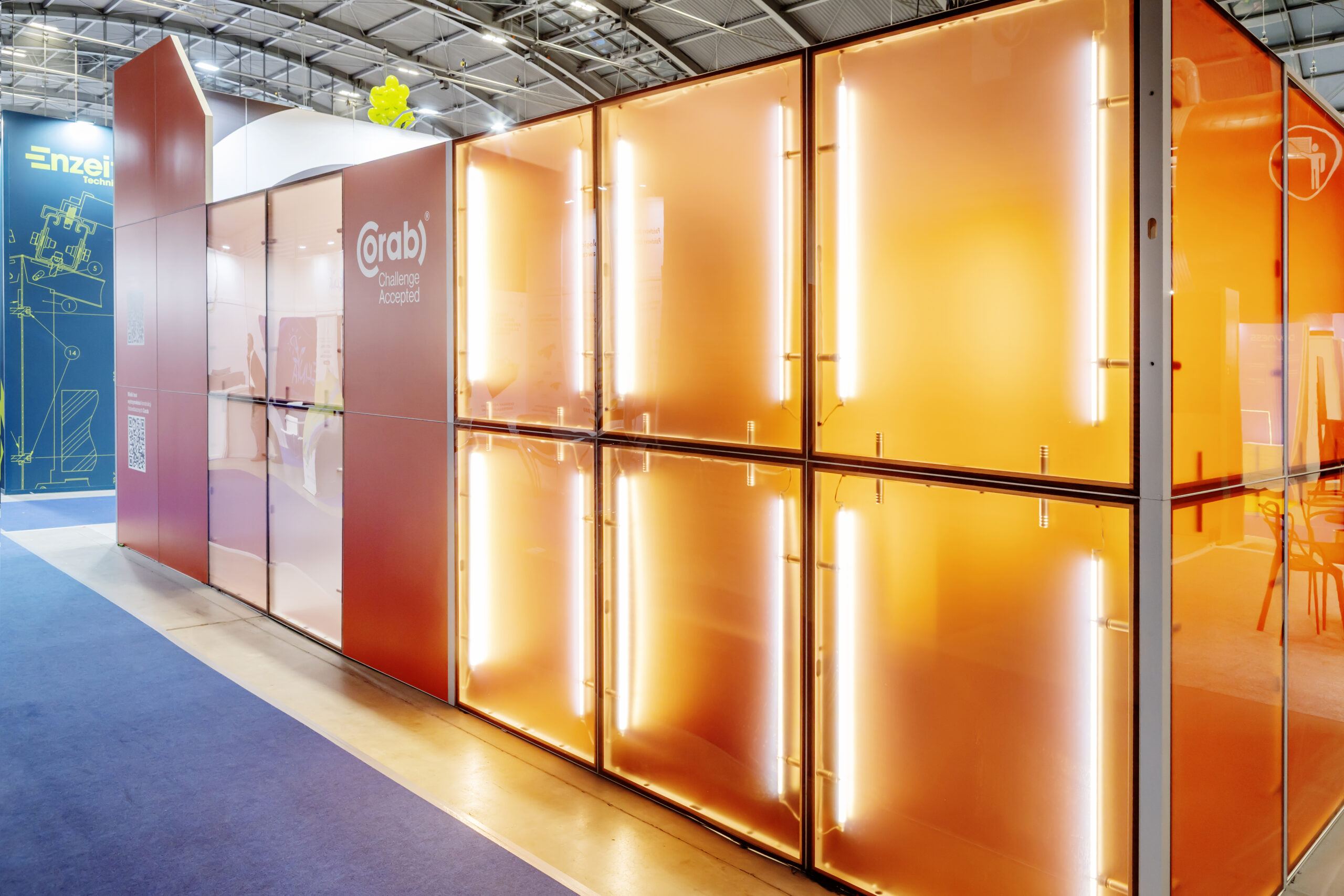 Zabudowa targowa dla marki Corab została zaprojektowana jako nowoczesne, wielofunkcyjne centrum relacji. Sercem stoiska stała się konstrukcja o powierzchni 9 m2, wyposażona w transparentne panele oraz zintegrowane oświetlenie liniowe. Pełniąc funkcję wizualnej „latarni”, przyciągała wzrok z każdego punktu hali, a jednocześnie dyskretnie wydzielała strefę spotkań. Ten zabieg pozwolił na idealny balans między biznesowym profesjonalizmem a efektem wow. W rezultacie powstało tętniące życiem stoisko, które odważnym designem i dopracowaną funkcjonalnością zdominowało aleję targową, podkreślając otwartość oraz charakter marki.