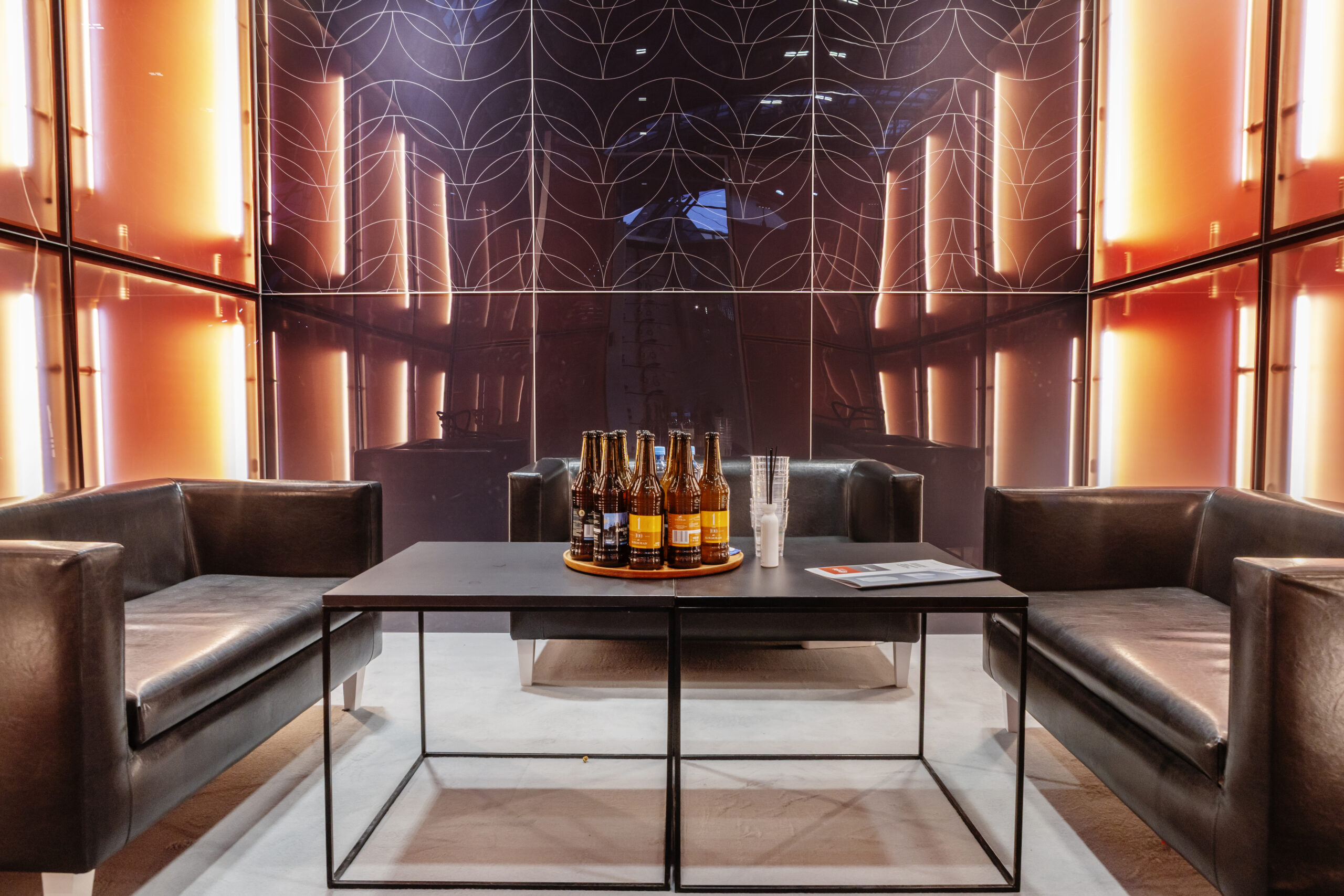Projekt stoiska oparty na otwartej strukturze, z rozbudowaną strefą spotkań oraz wyraźnie zdefiniowaną identyfikacją wizualną marki.
