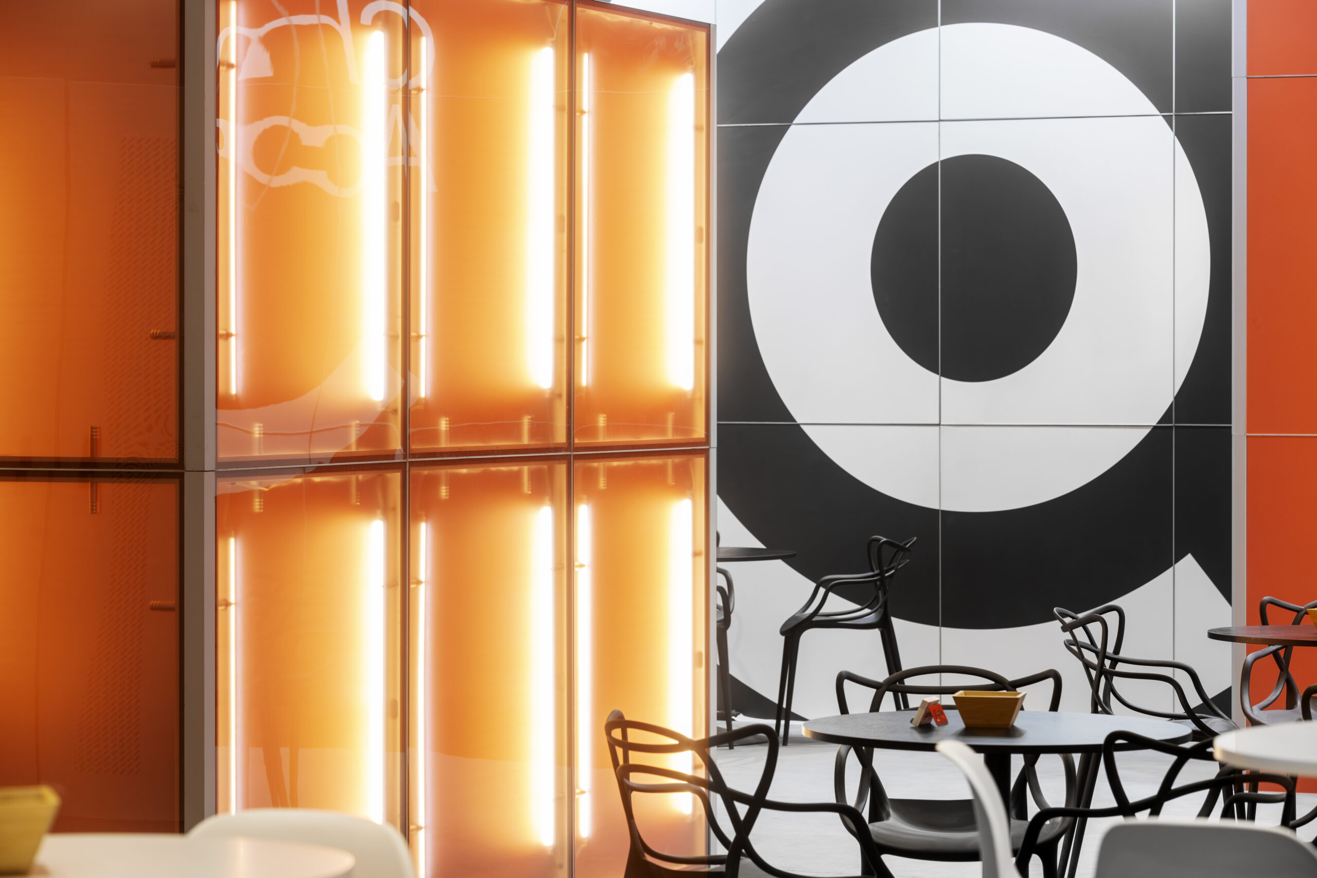 Dynamiczna gra kolorem – zestawienie pomarańczy z monochromatyczną bazą – oraz podział przestrzeni na otwarte i zamknięte strefy rozmów.
